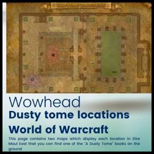 This page contains maps which display each location in Dire Maul West that you can find one of the "A dusty tome locations" books on the ground. If you're having trouble viewing the images on this page, click to enlarge them. For the locations of all the other Dusty Tomes in DM East and North follow … [Read more...] about Dusty tome locations World of Warcraft – Wowhead